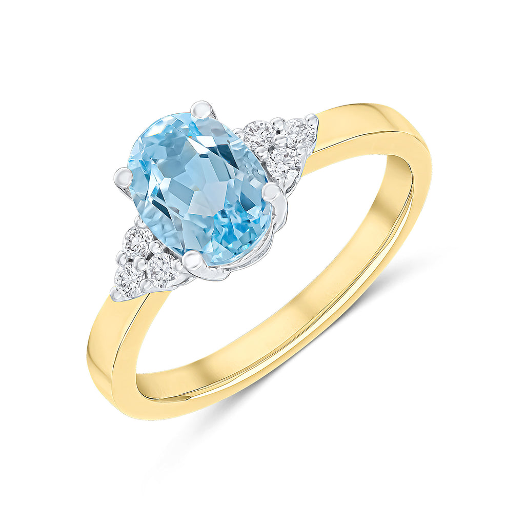 18CT Yellow and White Gold Oval Aquamarine & Diamond Trefoil Ring 8x6mm