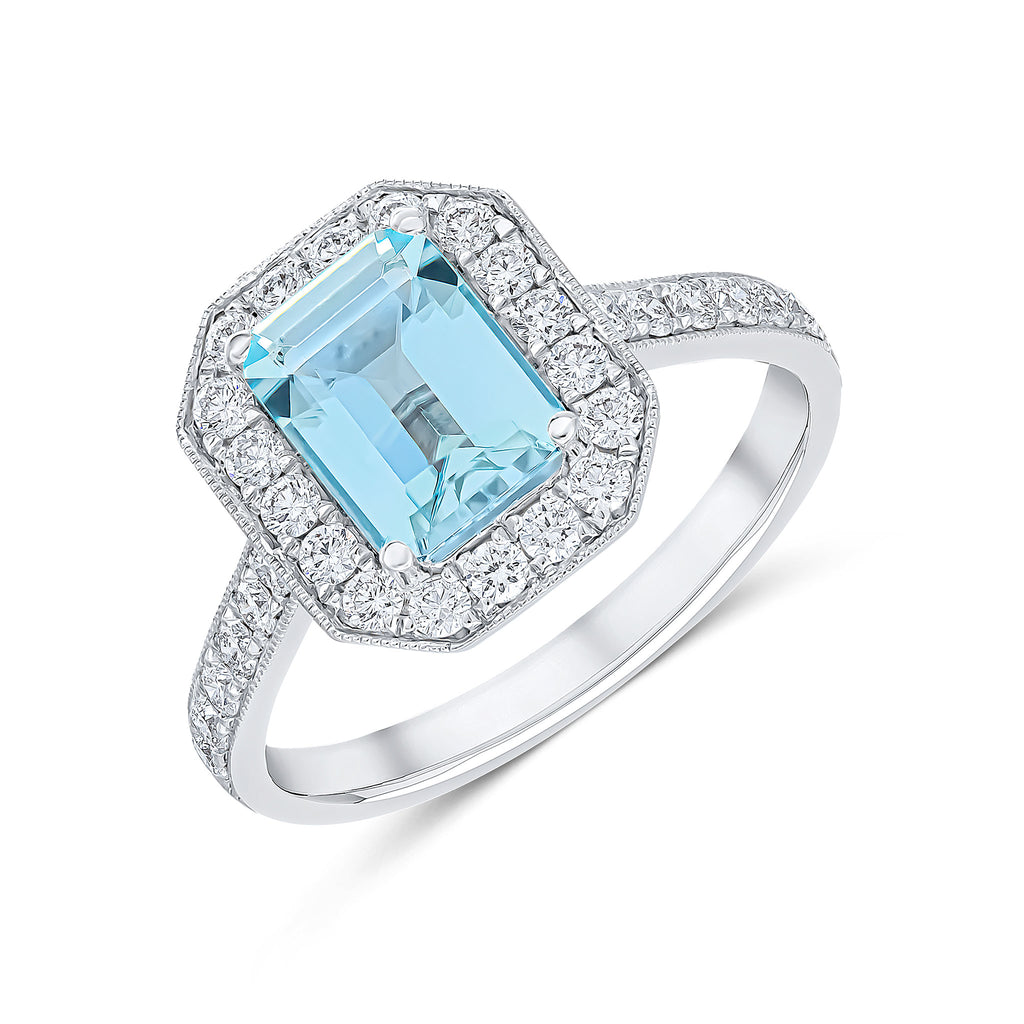 18CT White Gold Claw Set Octagonal Aquamarine & Millegrain Diamond Cluster Ring 7x5mm