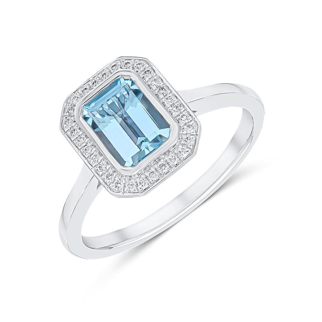 18CT White Gold Rubover Octagonal Aquamarine & Grain Set Diamond Cluster Ring 7x5mm
