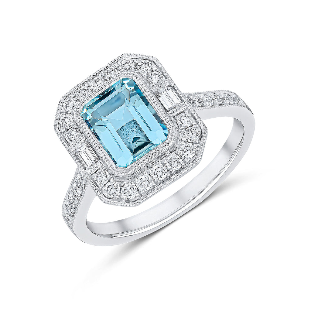 18CT White Gold Octagonal Aquamarine & Round & Baguette Diamond Millegrain Cluster Ring 8x6mm