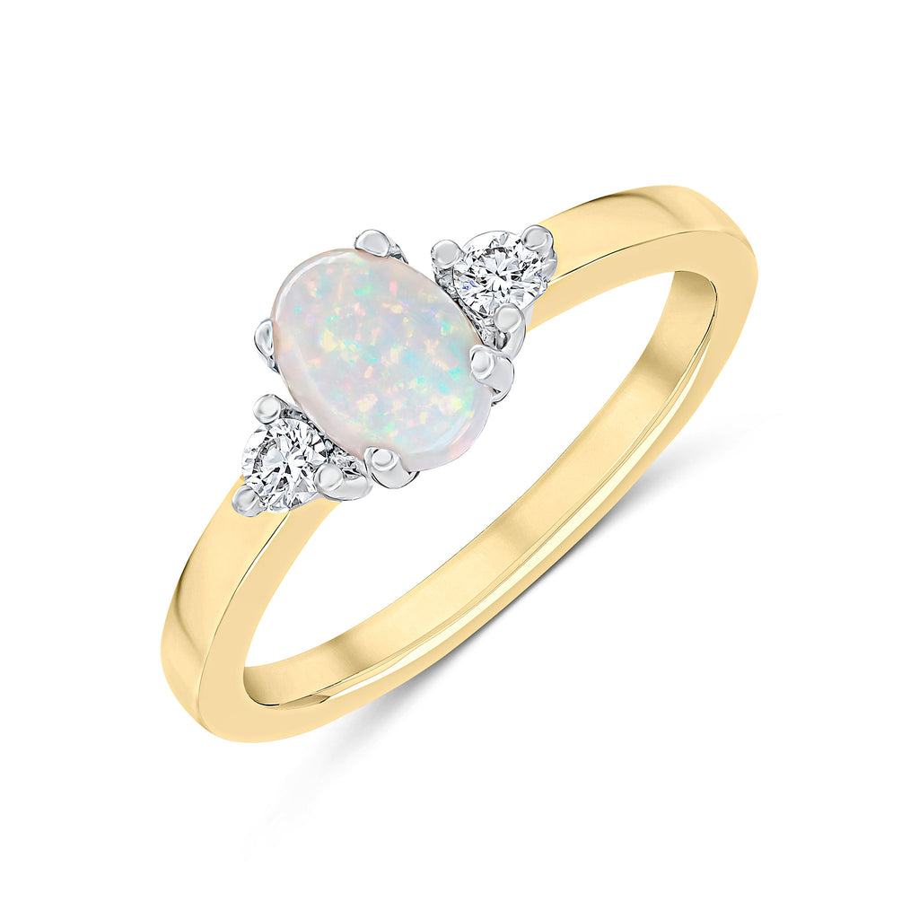 18CT Yellow Gold Claw Set Oval Opal & Round Diamond 3 Stone Ring 7x5mm
