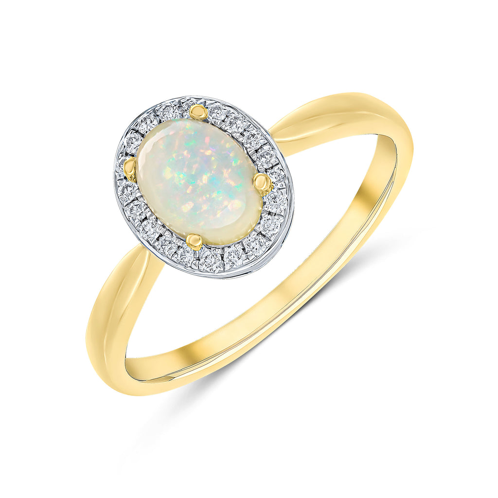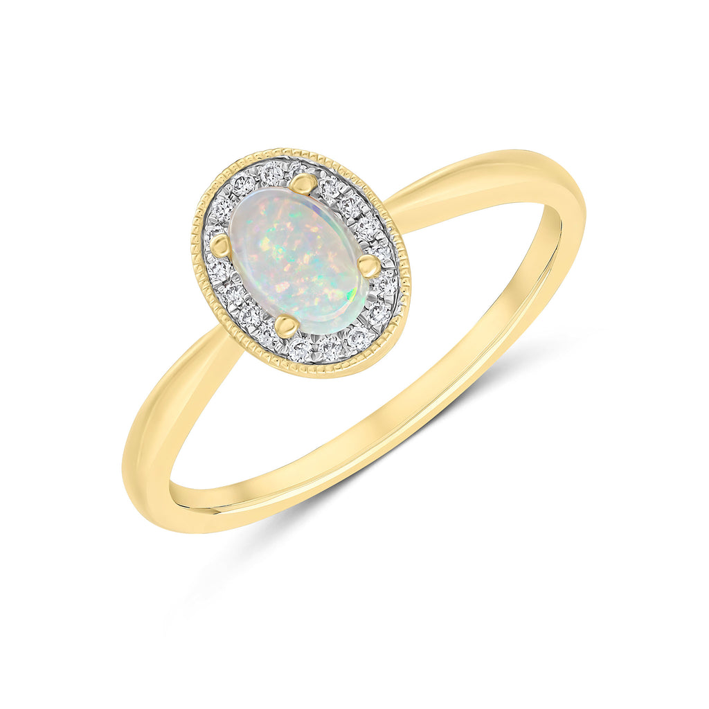 18CT Yellow Gold Claw Set Oval Opal & Round Diamond Cluster Ring with Millegrain Edge 6x4mm