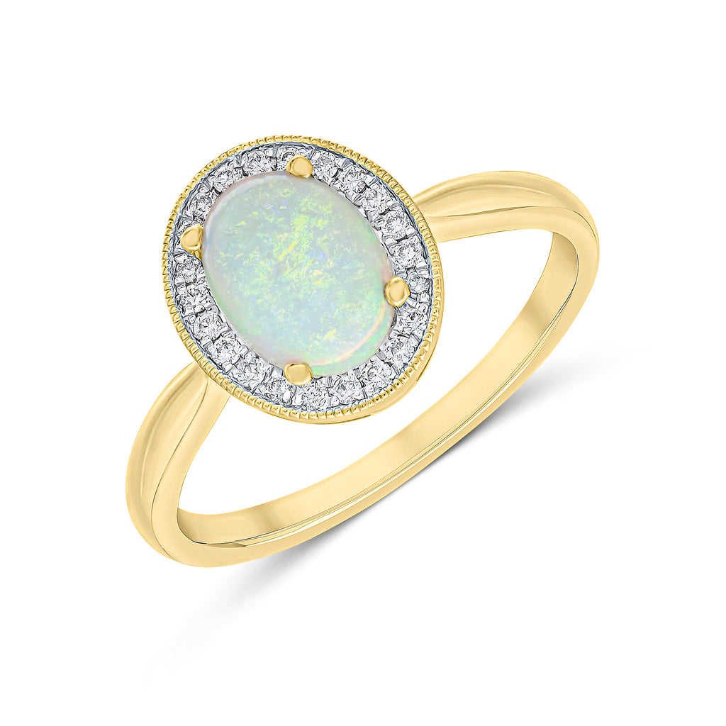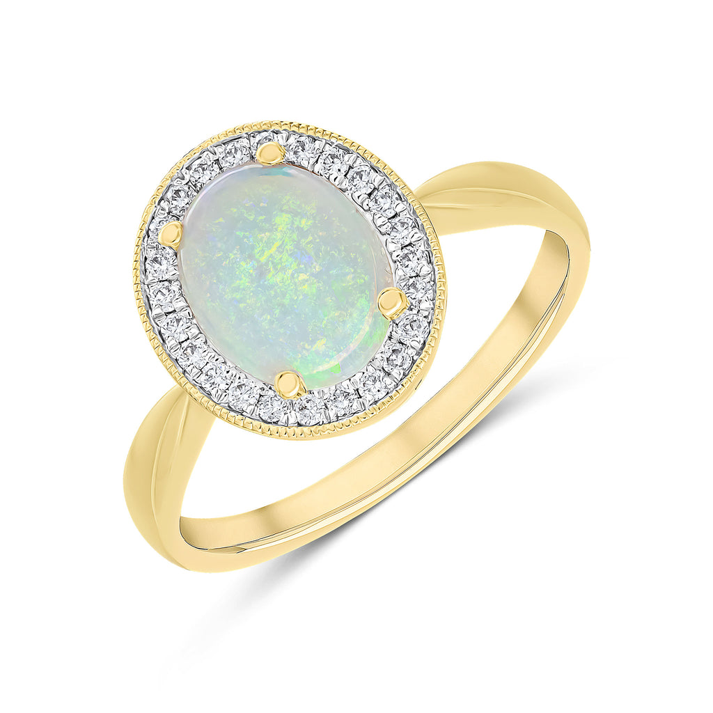 18CT Yellow Gold Claw Set Oval Opal & Round Diamond Cluster Ring with Millegrain Edge 8x6mm