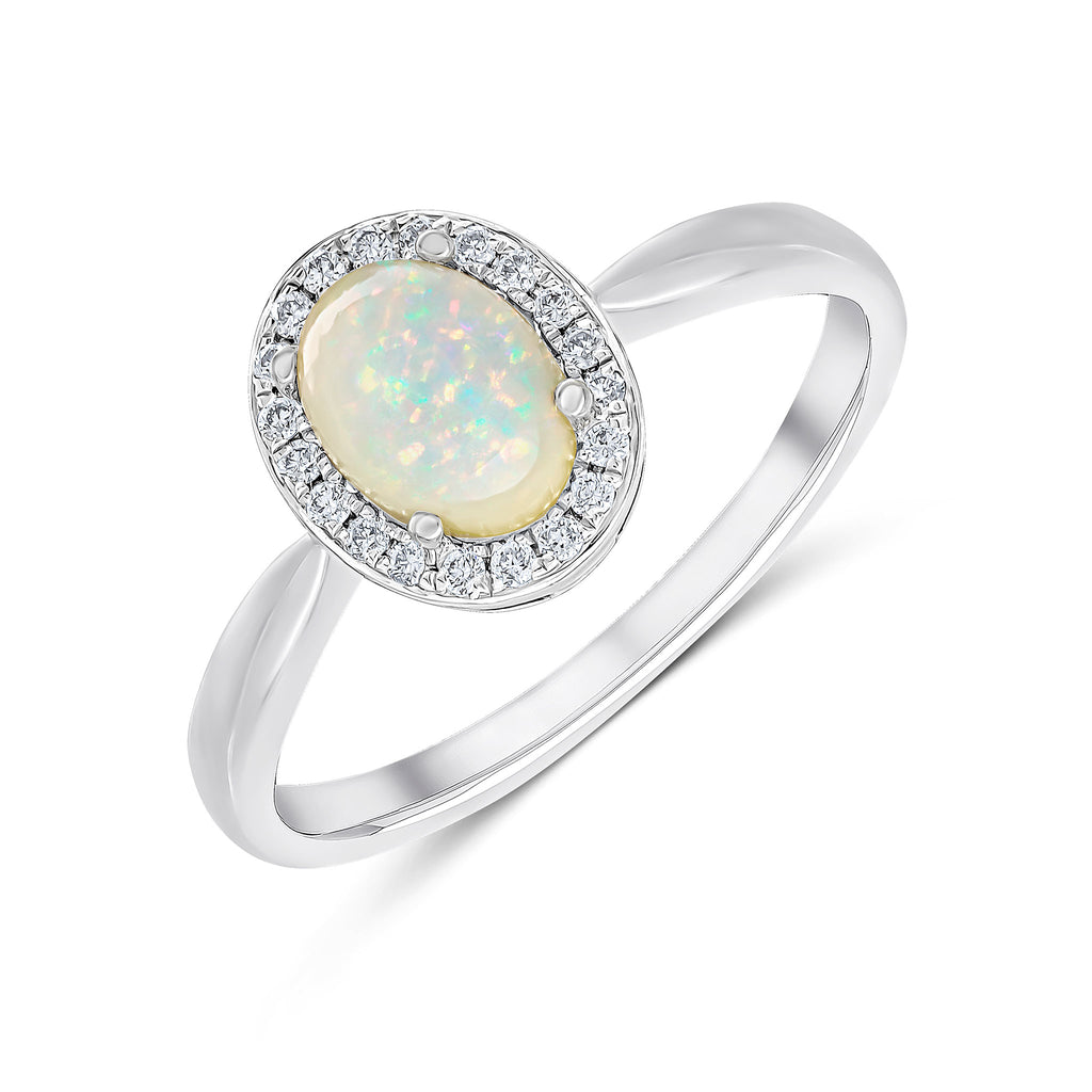 18CT White Gold Oval Opal & Grain Set Round Diamond Cluster Ring 7x5mm