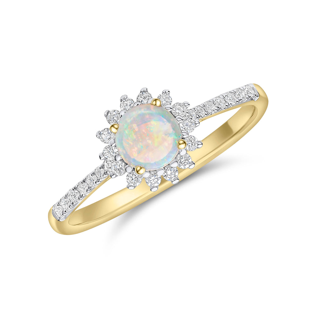 18CT Yellow Gold Round Opal & Diamond Claw Set Cluster Ring with Diamond Set Shoulders 5mm