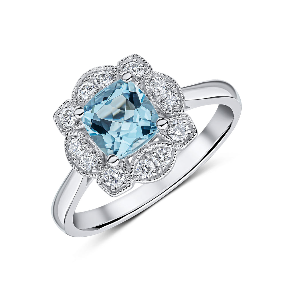 18CT White Gold Cushion Aquamarine & Round Diamond Millegrain Cluster Ring 6mm