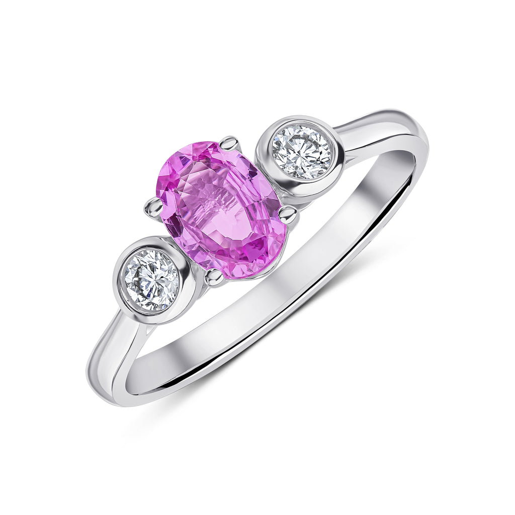 18CT White Gold Oval Pink Sapphire & Rubover Round Diamond Three Stone Ring 7x5mm