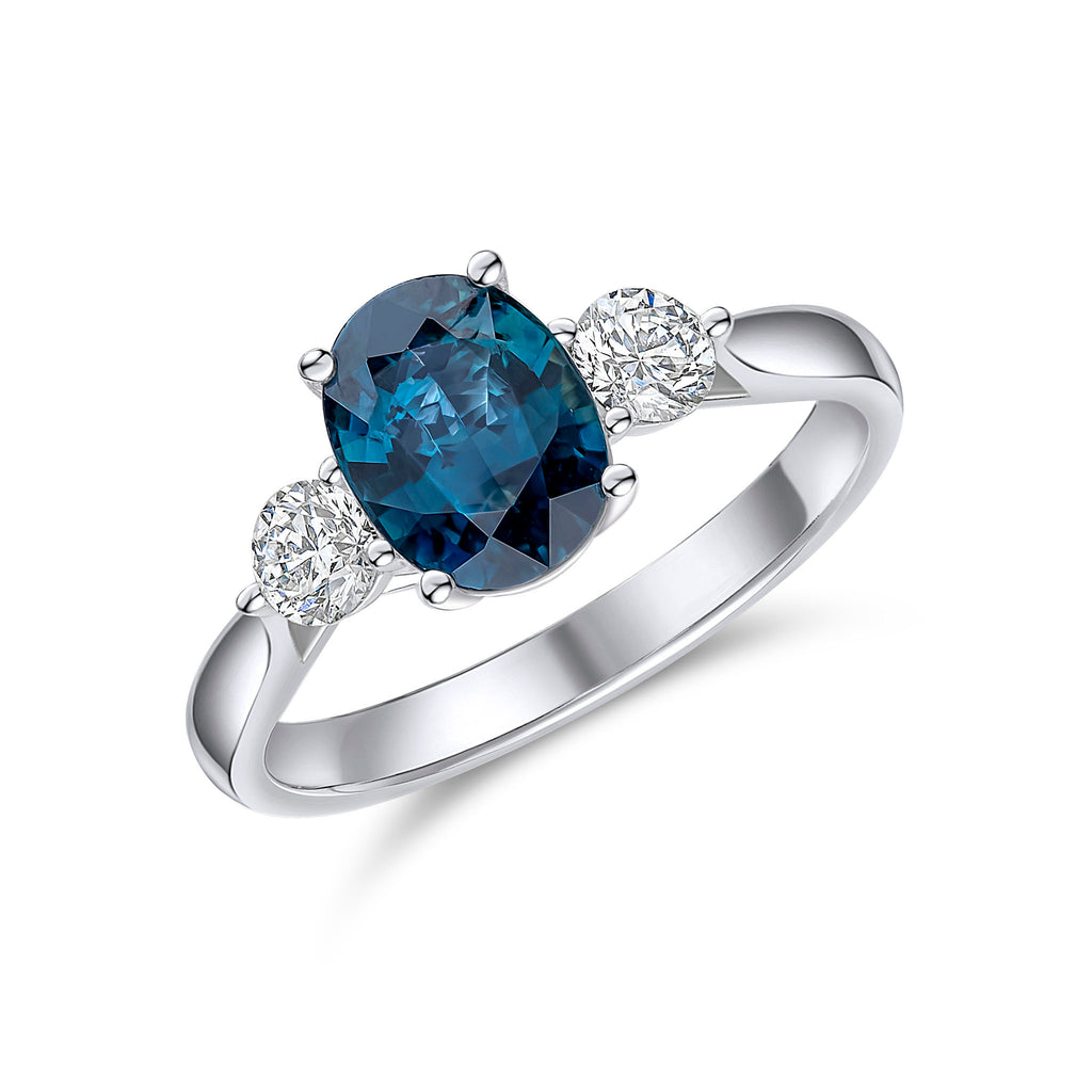 18CT White Gold Oval Sapphire & Round Diamond Claw Three Stone Ring 7x5mm