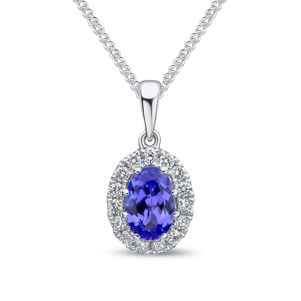 18CT White Gold Oval Tanzanite & Round Diamond Claw Cluster Pendant 7x5mm