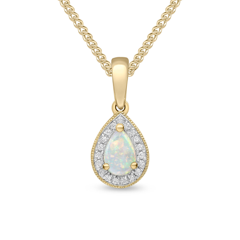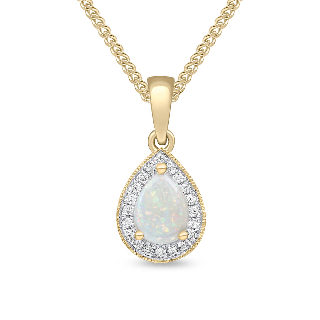 18CT Yellow Gold Claw Set Pear Shaped Opal & Round Diamond Cluster Pendant with Millegrain Edge 6x4mm