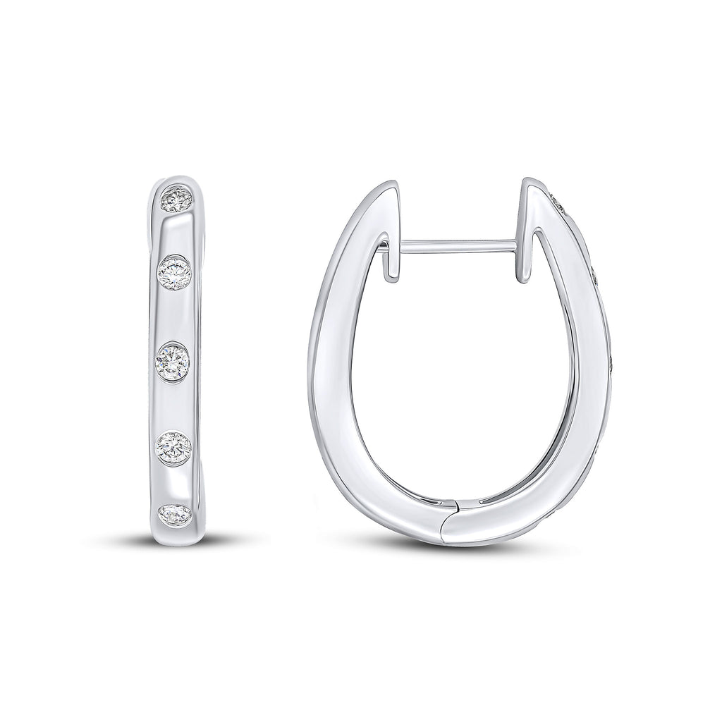 18CT White Gold Round Diamond Flush Set Oval Hinged Huggy Hoop Earrings