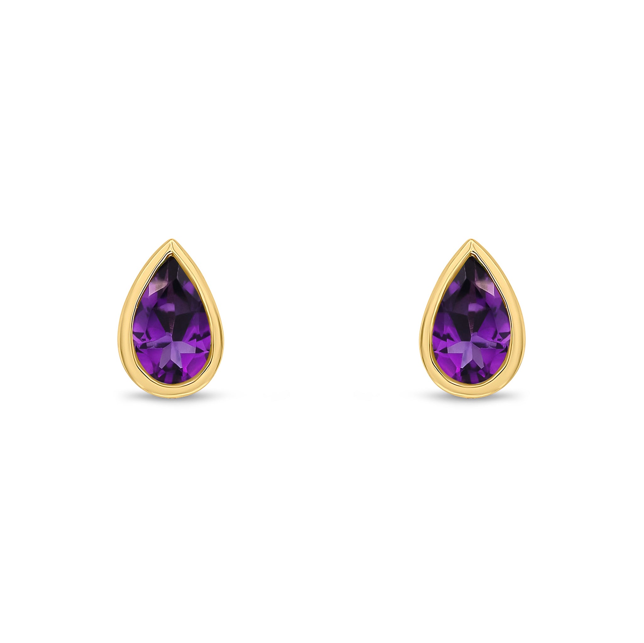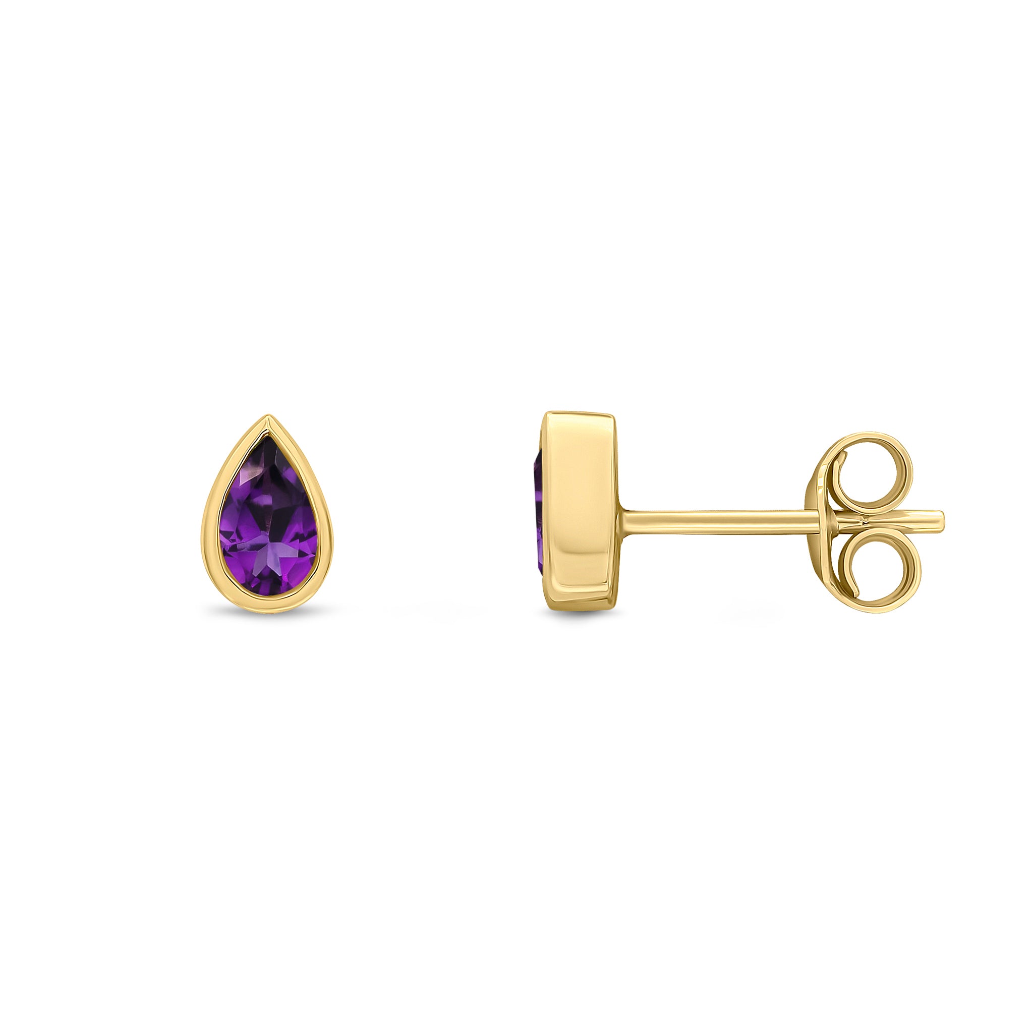 9CT Yellow Gold Pear Shaped Amethyst Rubover Stud Earrings 5x3mm