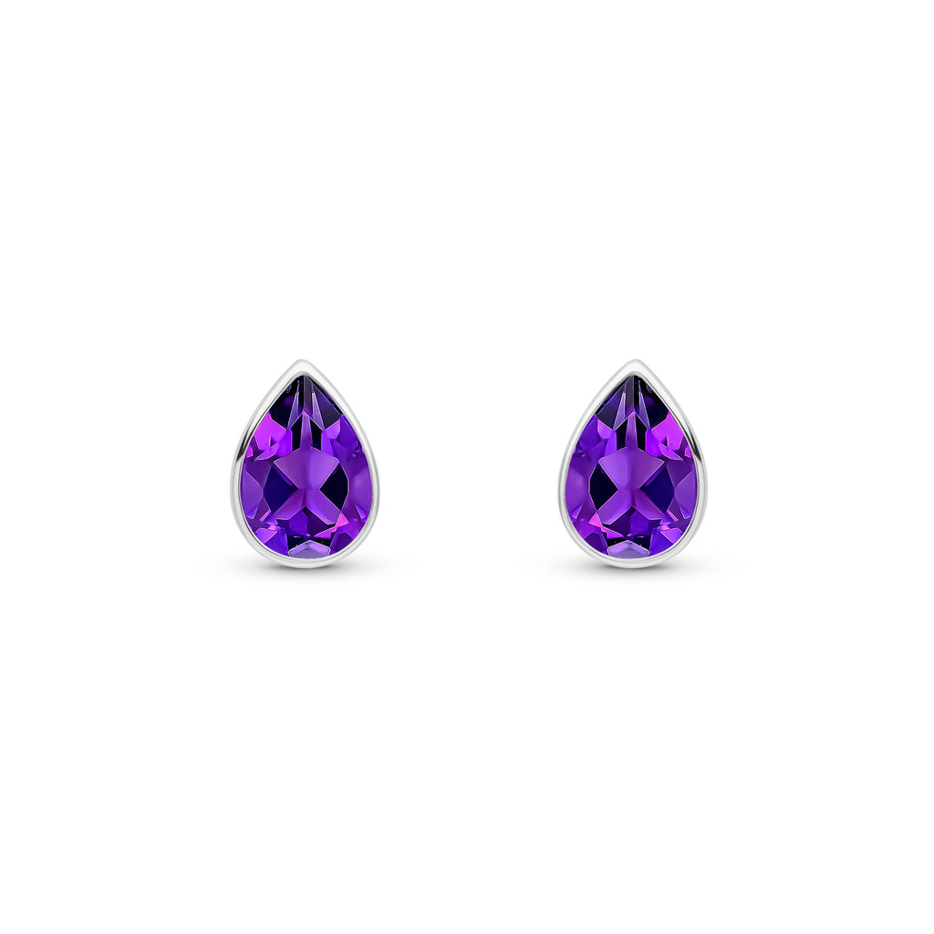 9CT White Gold Pear Shaped Amethyst Rubover Stud Earrings 7x5mm