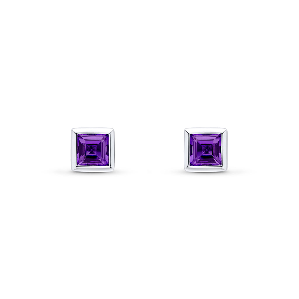 9CT White Gold Square Amethyst Rubover Stud Earrings 4mm
