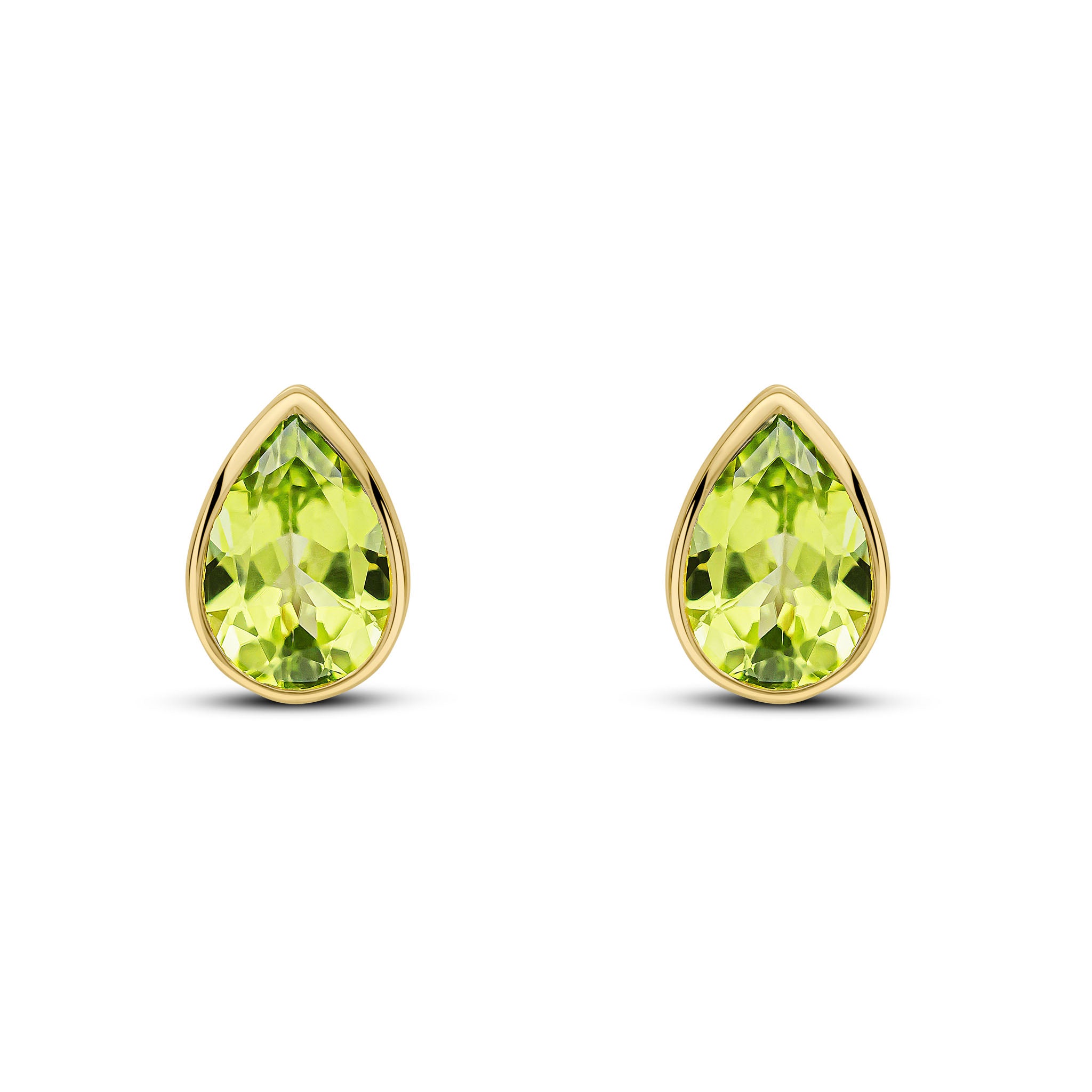 9CT Yellow Gold Pear Shaped Peridot Rubover Stud Earrings 7x5mm