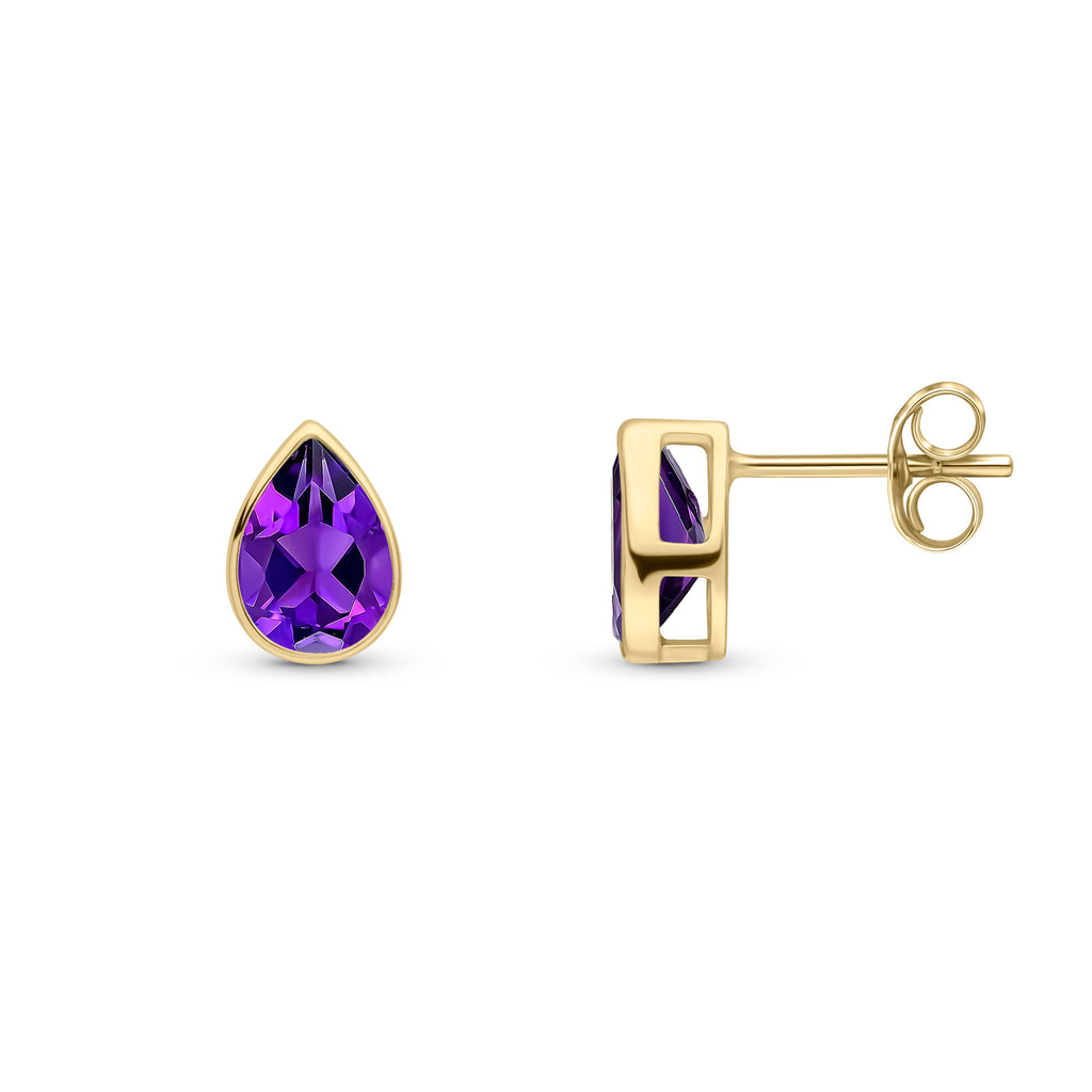 9CT Yellow Gold Pear Shaped Amethyst Rubover Stud Earrings 7x5mm