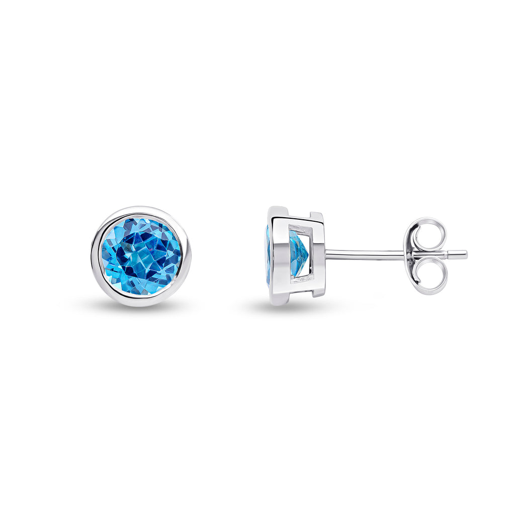 9CT White Gold Round Swiss Blue Topaz Rubover Stud Earrings 6mm
