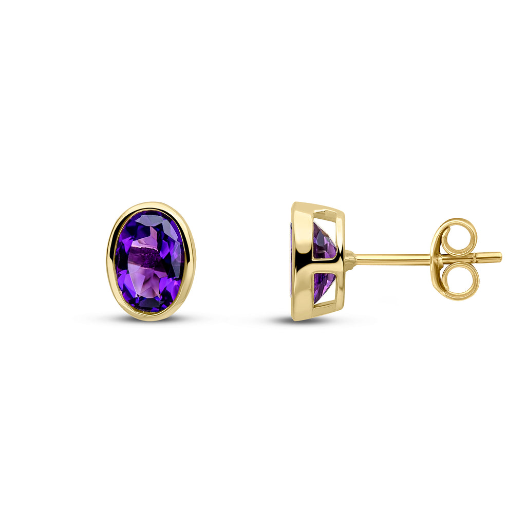 9CT Yellow Gold Oval Amethyst Rubover Stud Earrings 7x5mm