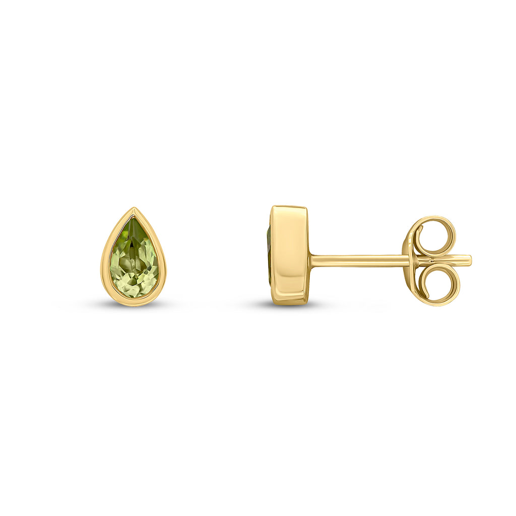9CT Yellow Gold Pear Shaped Peridot Rubover Stud Earrings 5x3mm