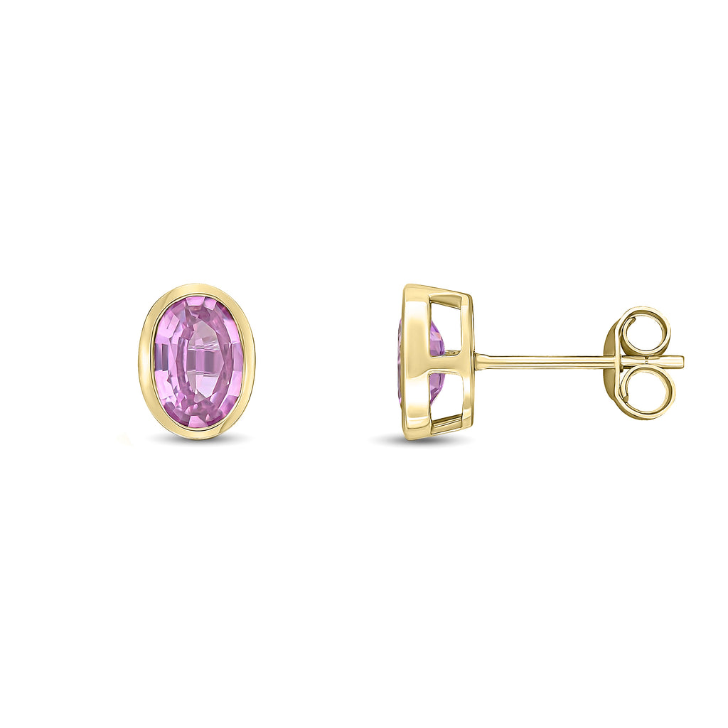 9CT Yellow Gold Oval Pink Sapphire Rubover Stud Earrings 7x5mm