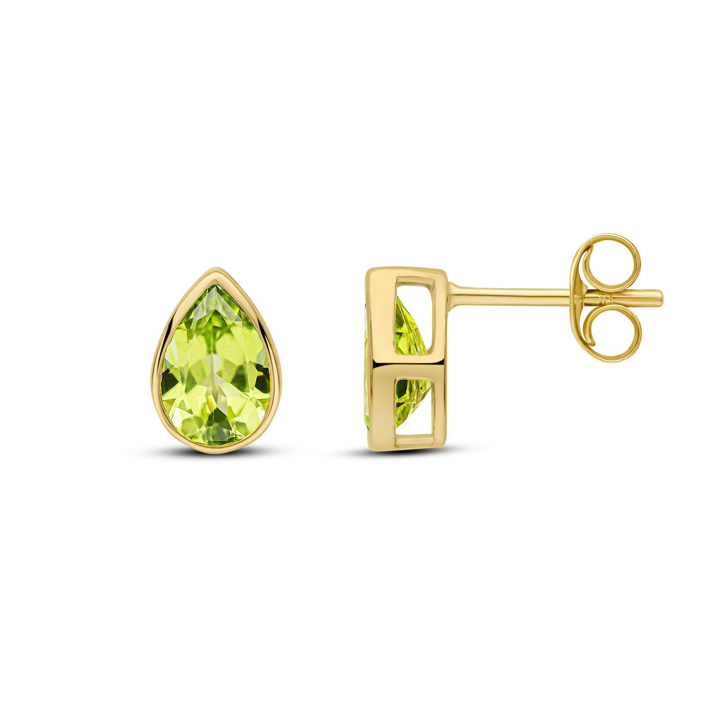 9CT Yellow Gold Pear Shaped Peridot Rubover Stud Earrings 7x5mm