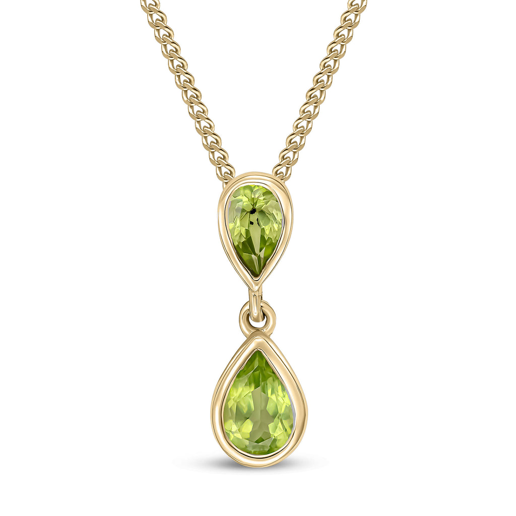 9CT Yellow Gold Pear Shaped Peridot Rubover Double Drop Pendant