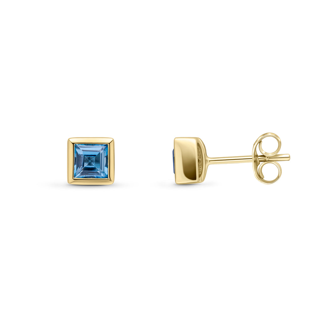 9CT Yellow Gold Square London Blue Topaz Rubover Stud Earrings 4mm