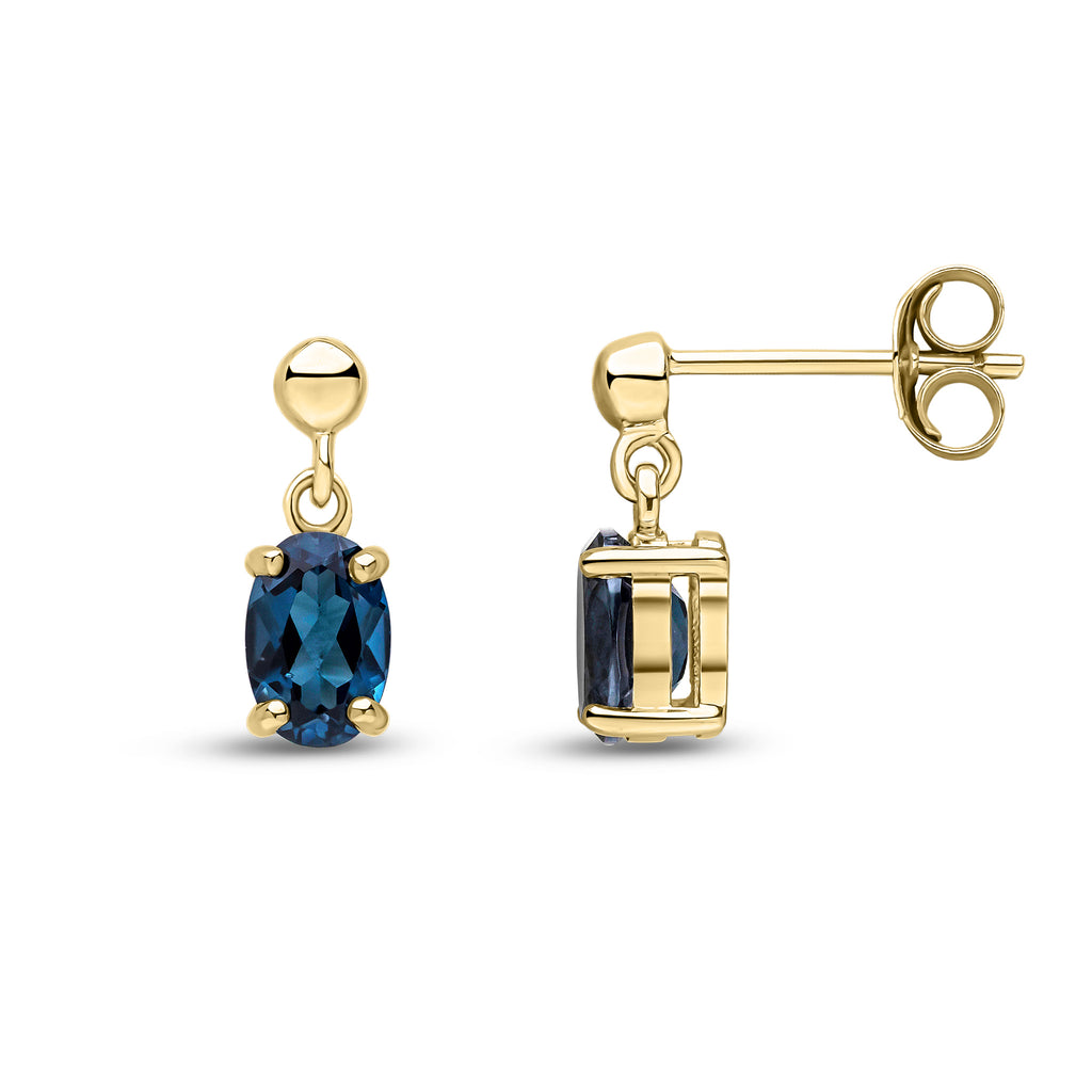 9CT Yellow Gold Oval London Blue Topaz Claw Drop Earrings 6x4mm