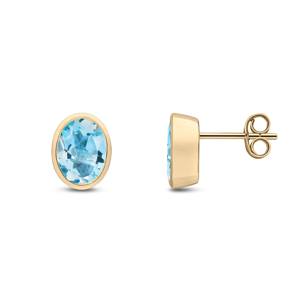 9CT Yellow Gold Oval Swiss Blue Topaz Rubover Stud Earrings 8x6mm