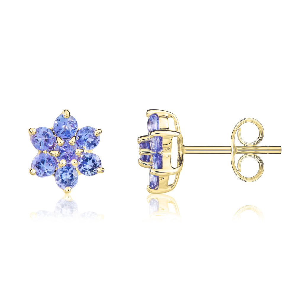 9CT Yellow Gold Round Tanzanite 7 Stone Flower Cluster Stud Earrings