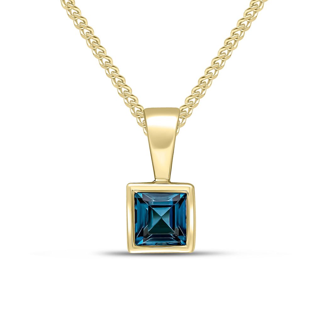 9CT Yellow Gold Square London Blue Topaz Rubover Pendant 4mm