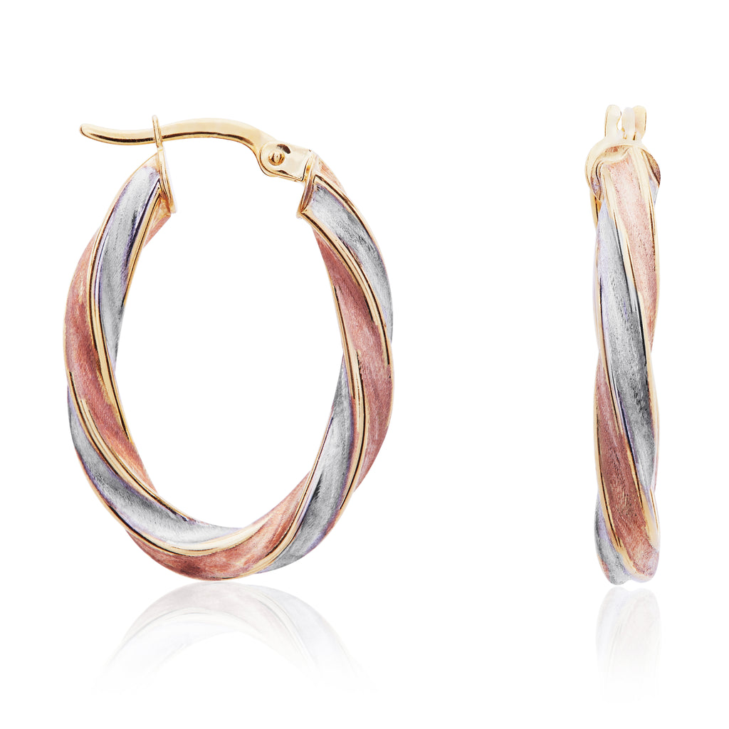 9CT Three Tone Yellow, White & Rose Gold Oval Twist Hoop Earrings