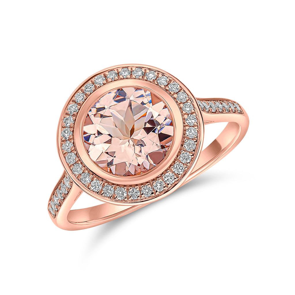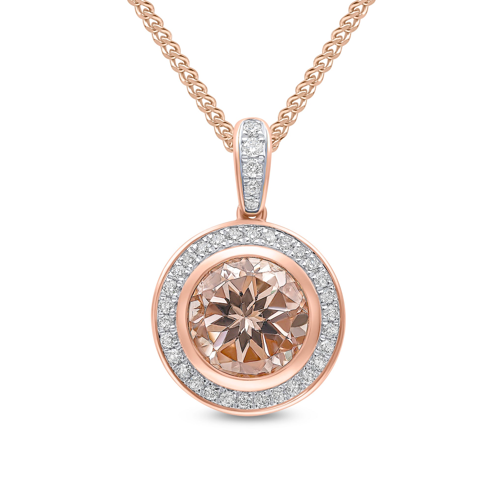 18CT Rose Gold Rubover Round Morganite & Grain Set Diamond Cluster Pendant with Diamond Set Loop 8mm