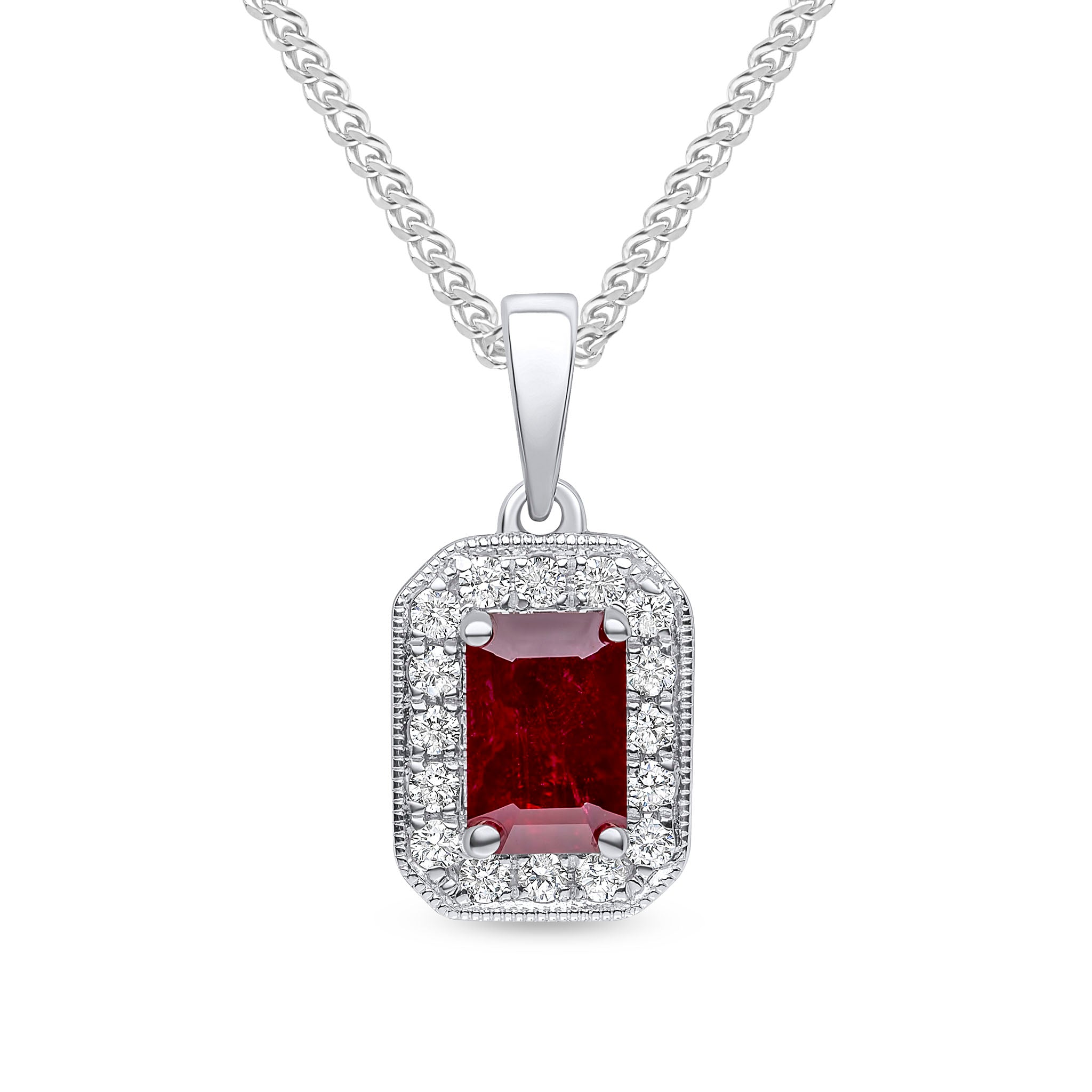 18CT White Gold Octagonal Ruby & Millegrain Diamond Cluster Pendant 6x4mm