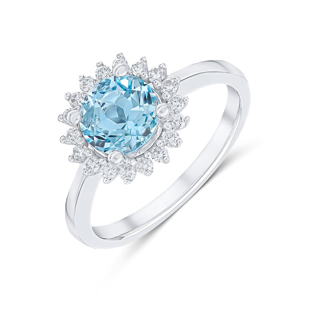 18CT White Gold Round Aquamarine & Diamond Claw Set Cluster Ring 7mm