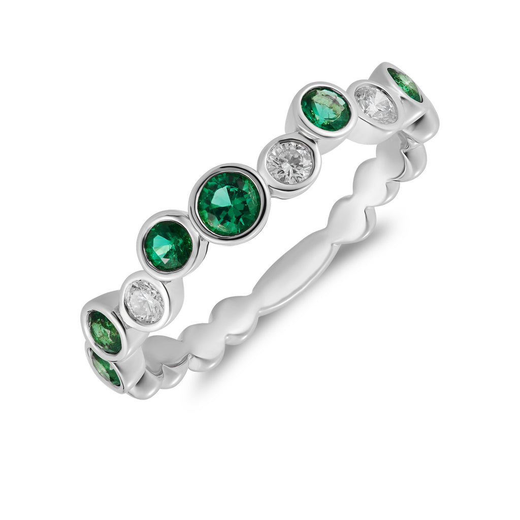 18CT White Gold Round Emerald & Diamond Single Row Bubble Ring