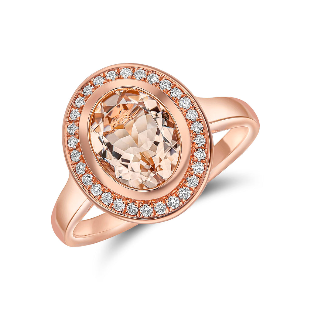 18CT Rose Gold Rubover Oval Morganite & Grain Set Diamond Cluster Ring 9x7mm