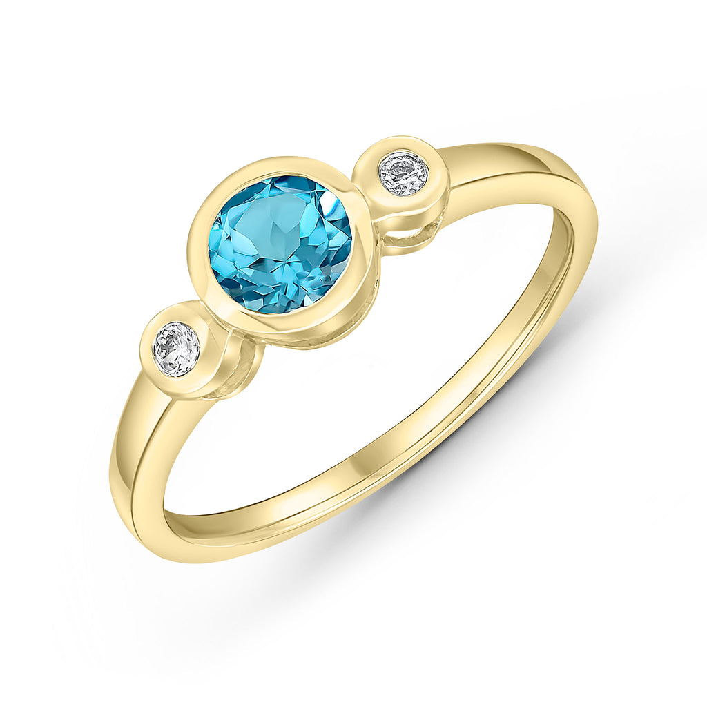 9CT Yellow Gold Round Swiss Blue Topaz & Diamond Three Stone Ring 5mm