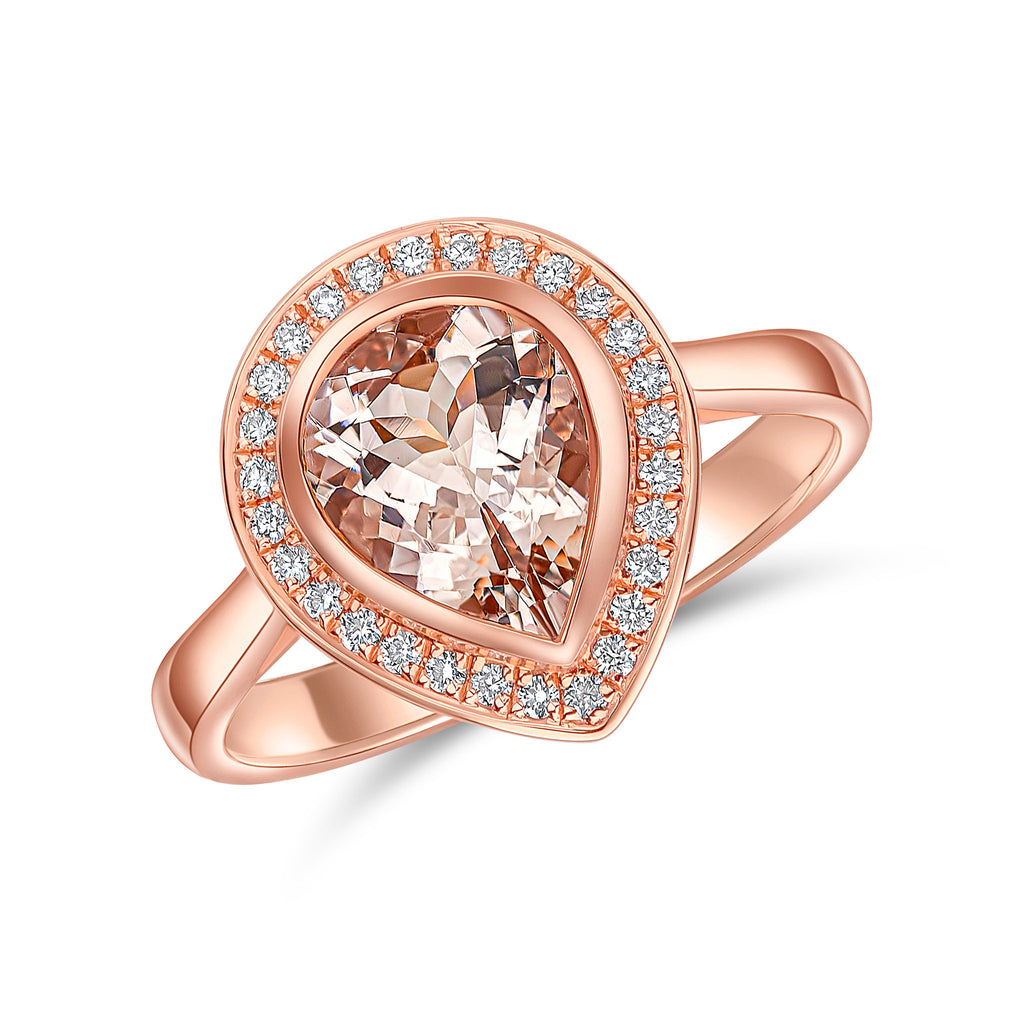 18CT Rose Gold Rubover Pear Shaped Morganite & Grain Set Diamond Cluster Ring 9x7mm