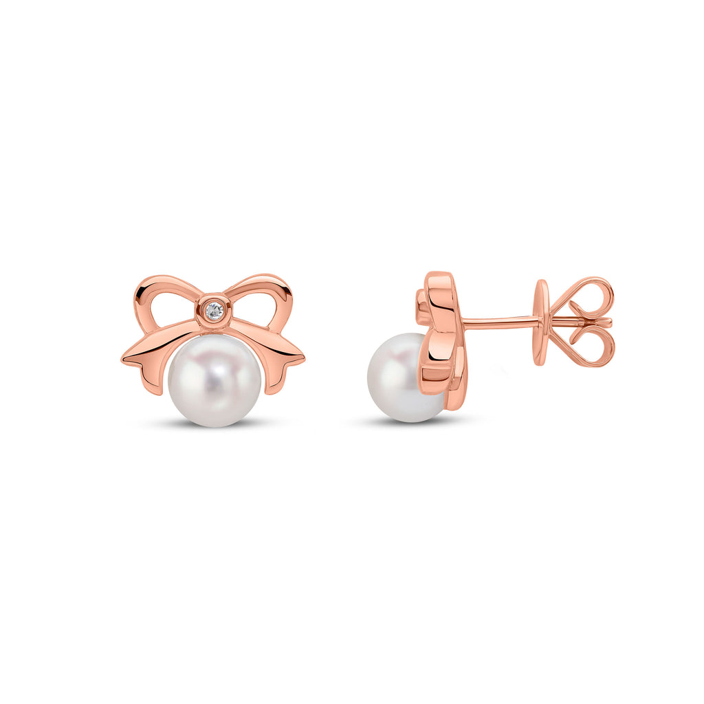 9CT Rose Gold Oval Pearl & Round Diamond Bow Stud Earrings