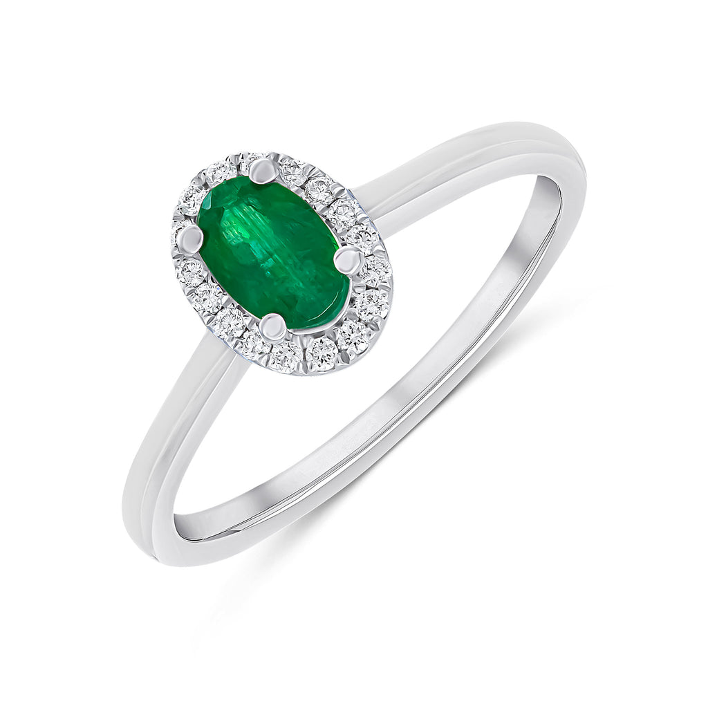 18CT White Gold Oval Emerald & Round Diamond Cluster Ring 6x4mm