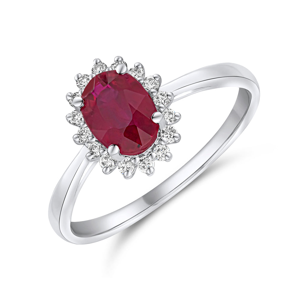 18CT White Gold Oval Ruby & Round Diamond Claw Set Cluster Ring 7x5mm