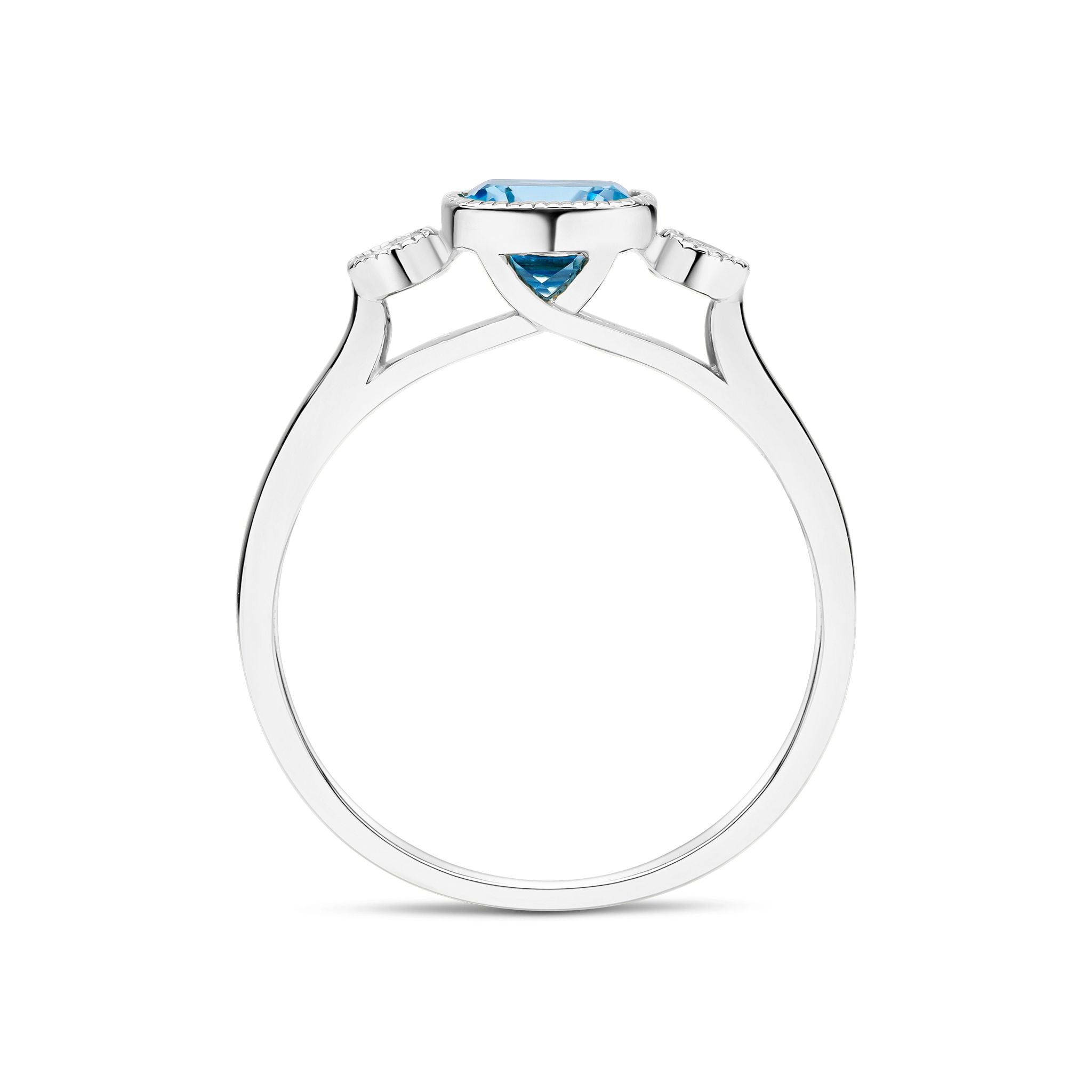 9CT White Gold Millegrain Cushion London Blue Topaz & Round Diamond Three Stone Ring 6mm