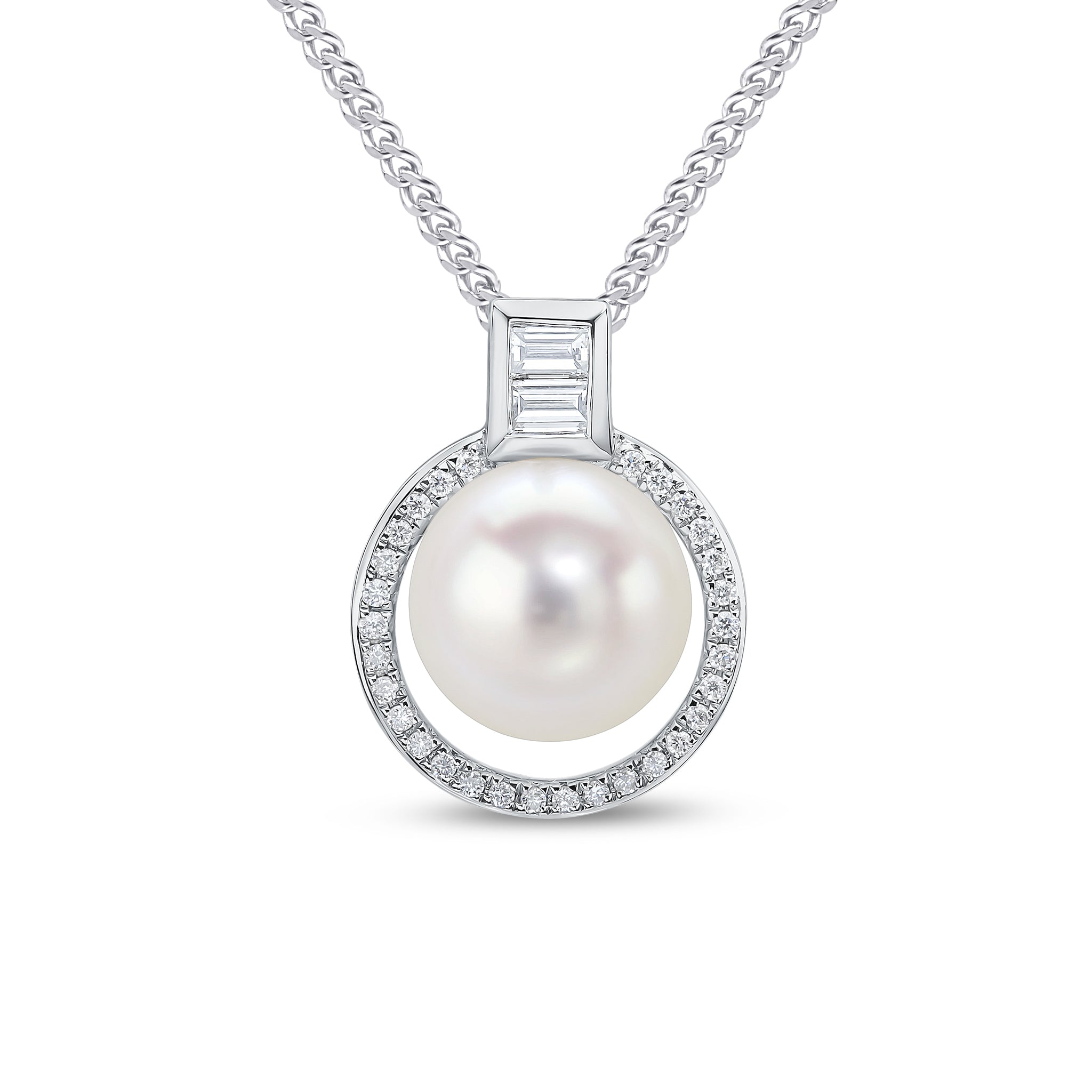 18ct White Gold Pearl & Diamond Halo Cluster Pendant with Baguette Diamond Loop Top
