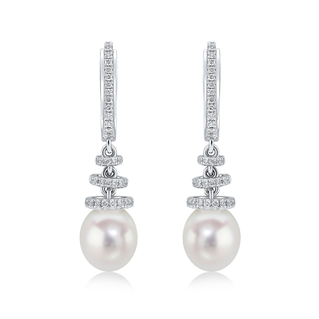 18ct White Gold Pearl & Diamond Hoop & Spiral Top Drop Earrings