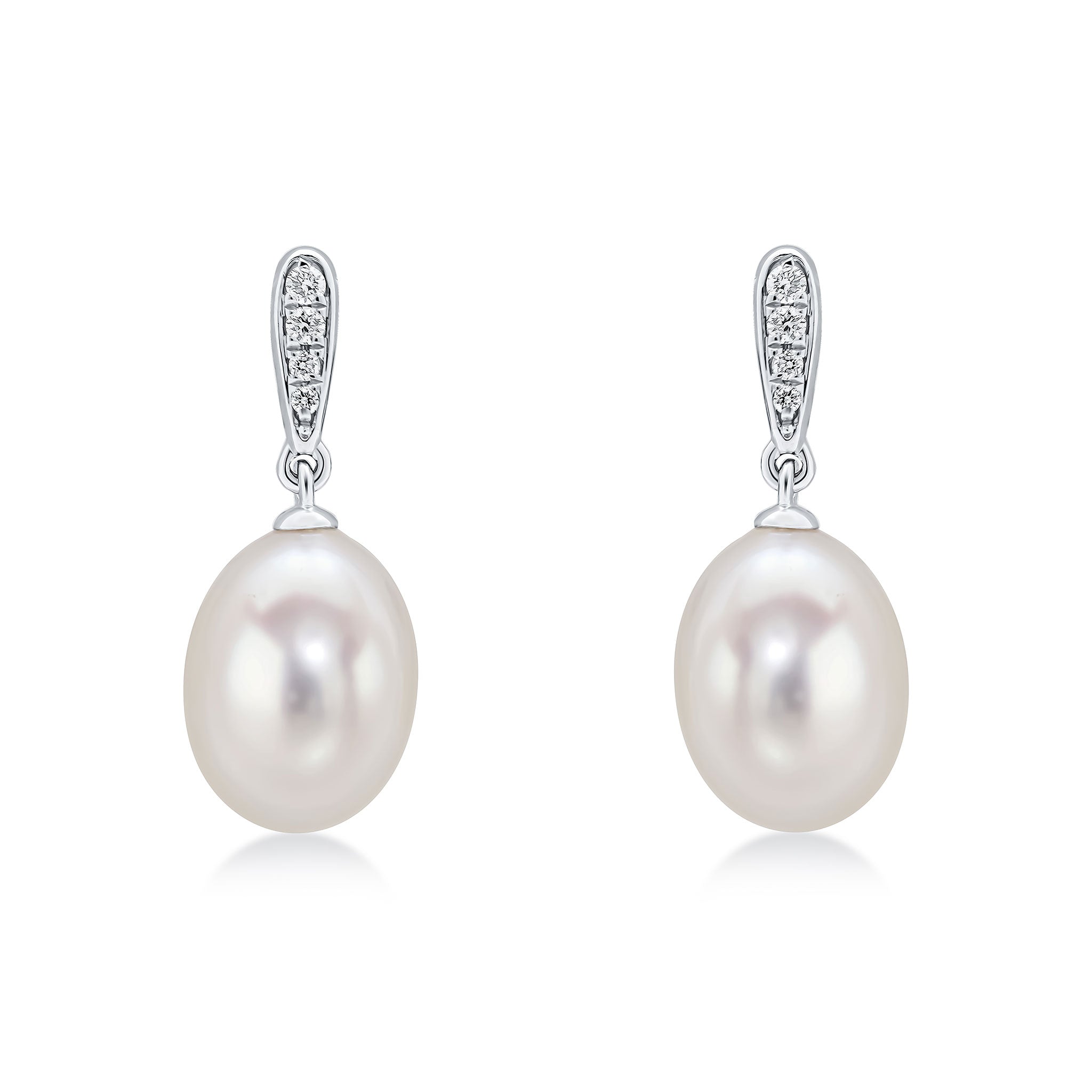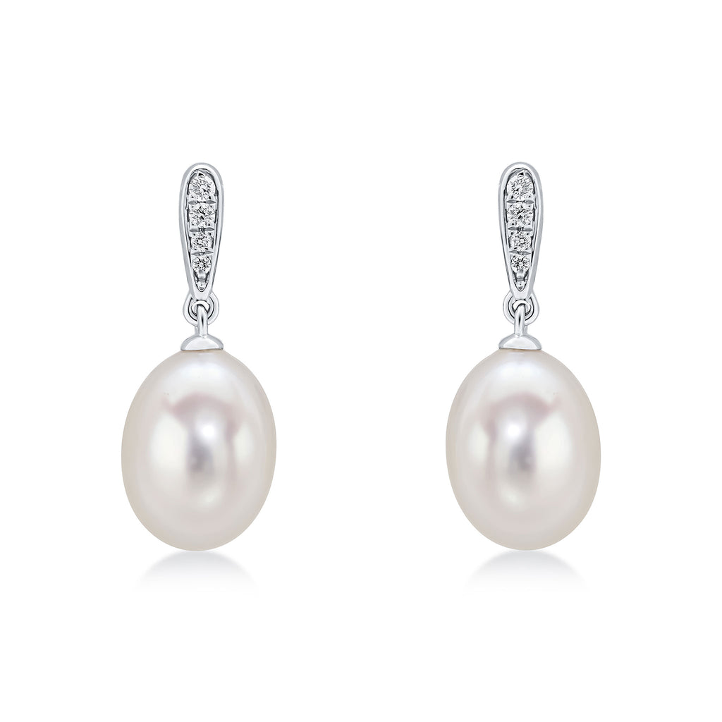 18CT White Gold, Pearl & Diamond Line Drop Earrings
