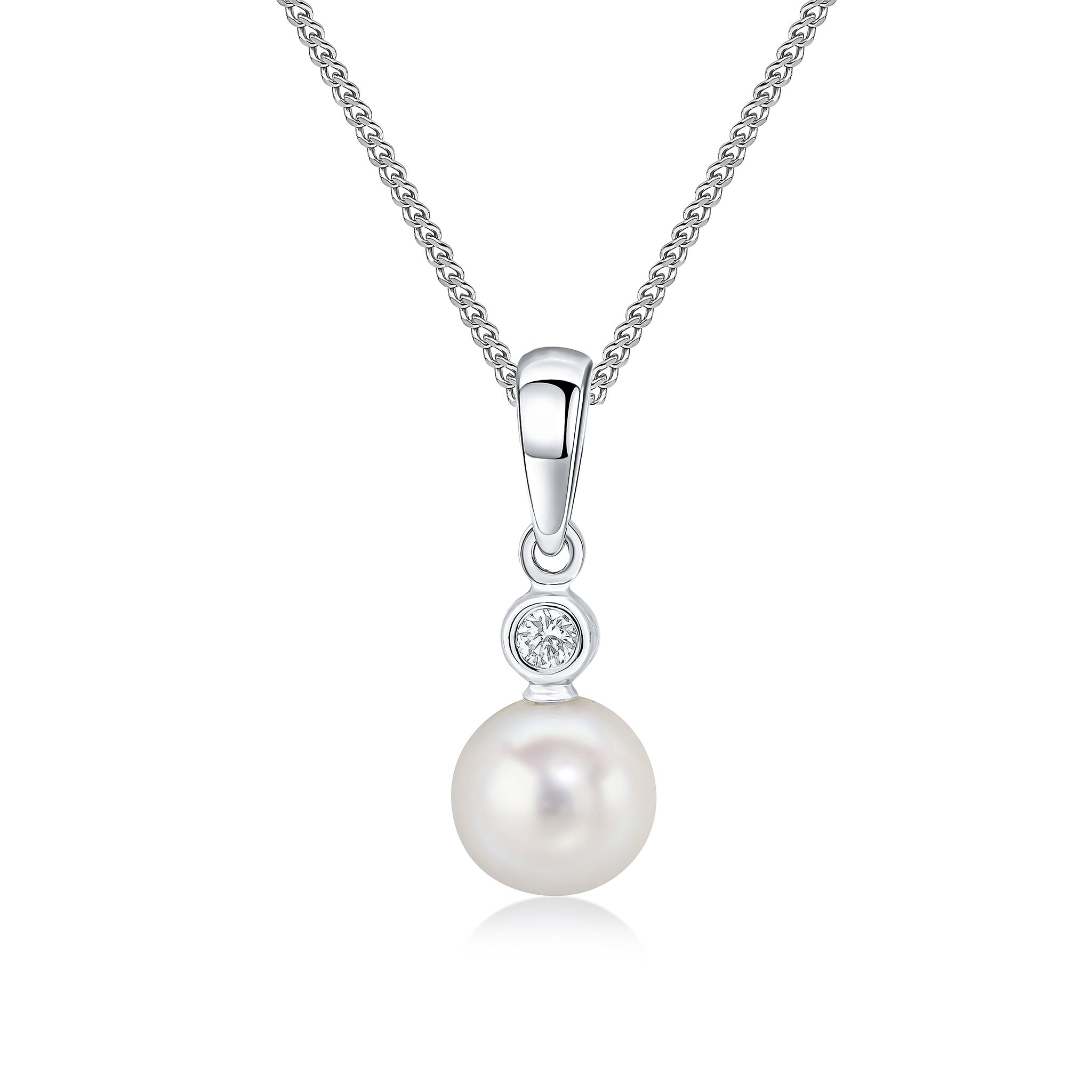 18CT White Gold Pearl & Rubover Diamond Two Stone Pendant 6-6.5mm