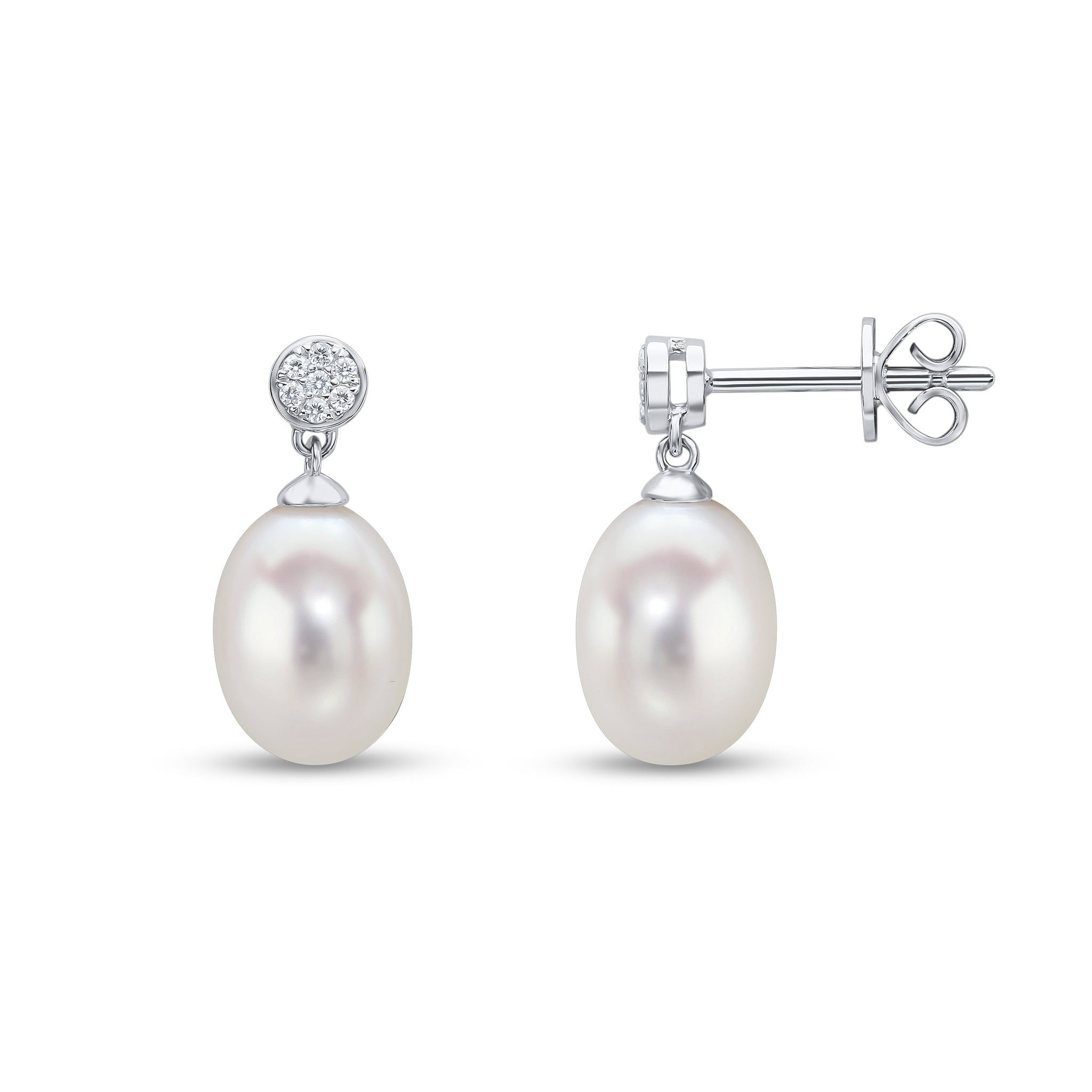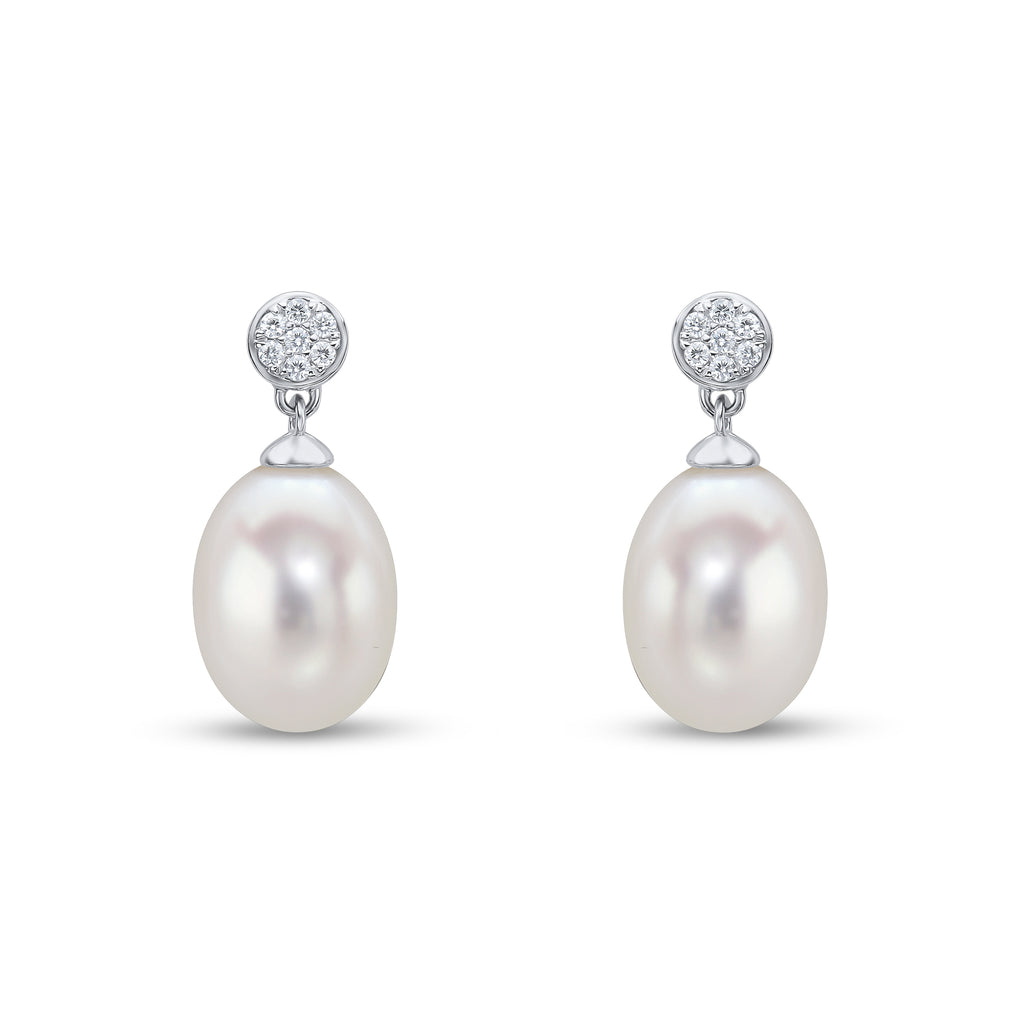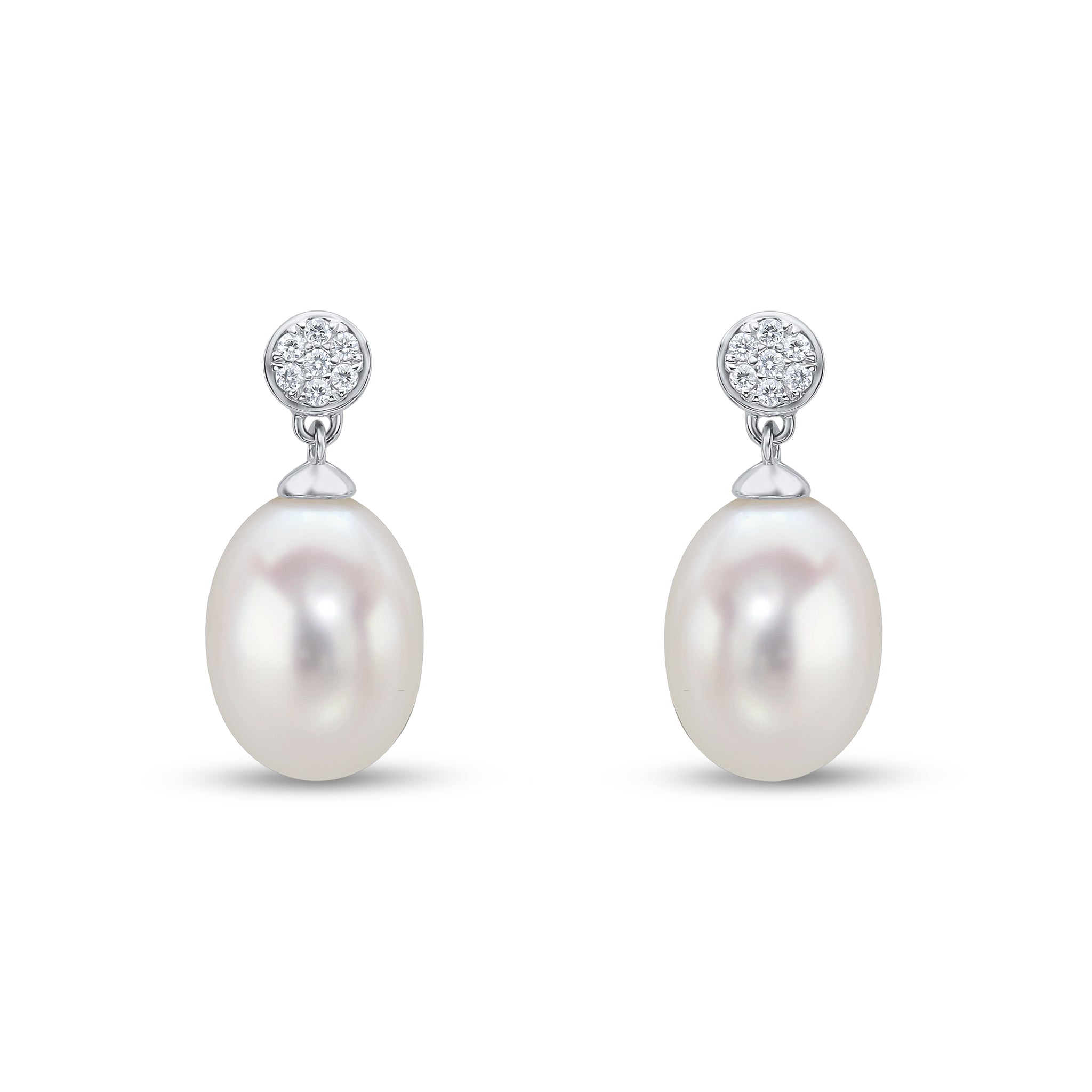 18CT White Gold Pearl & Grain Set Diamond Disc Top Drop Earrings