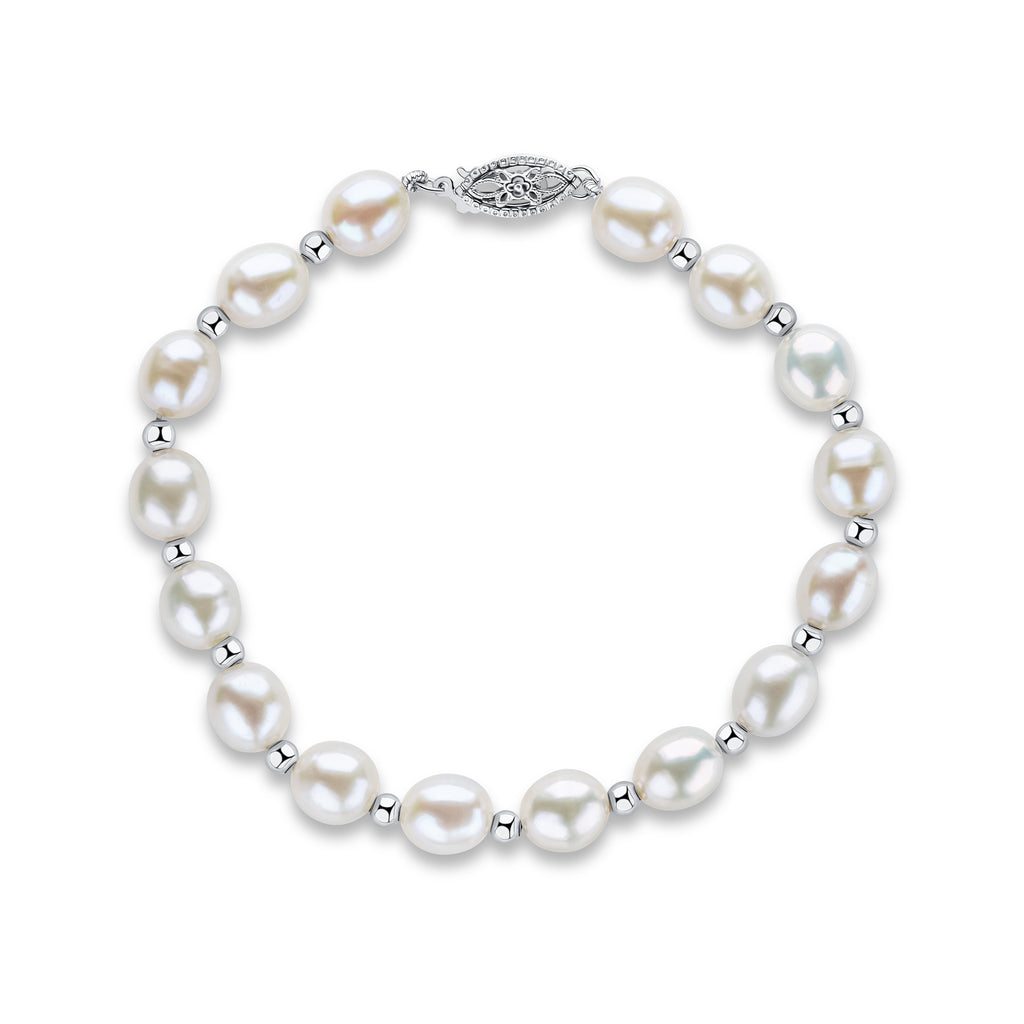 9CT White Gold Bead and 7mm White Oval Pearl Bracelet 7.5"
