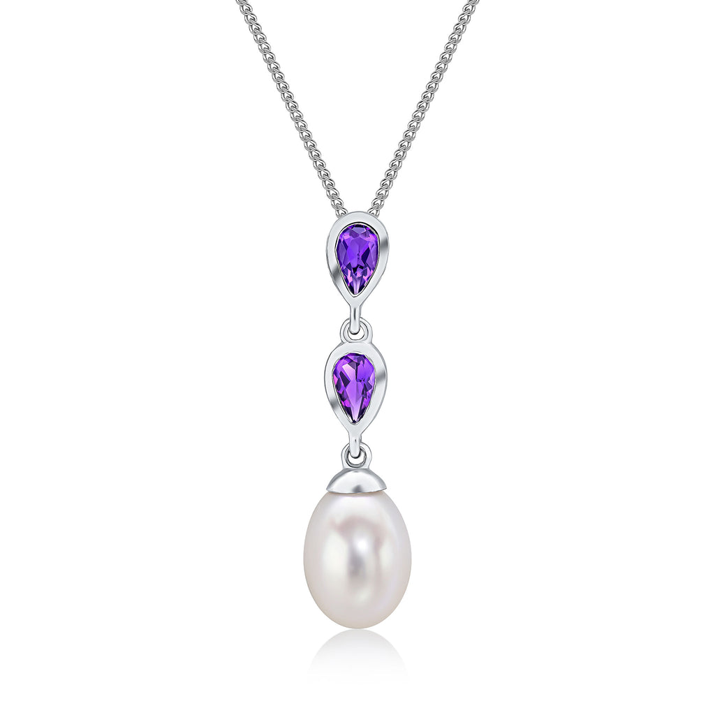 9CT White Gold Pearl & Pear Shaped Amethyst Triple Drop Pendant